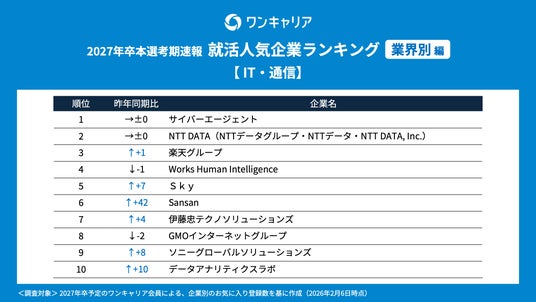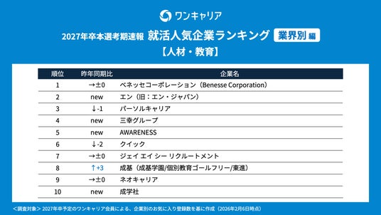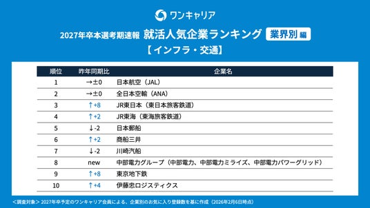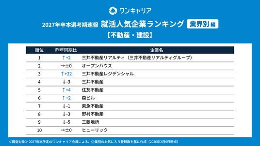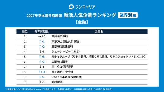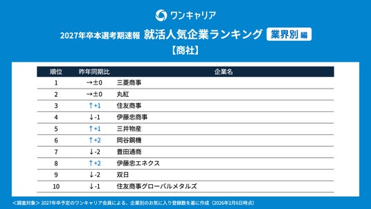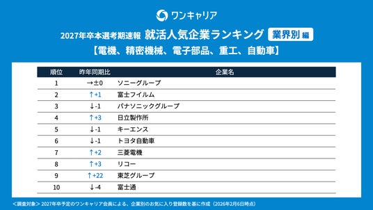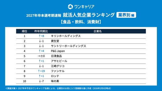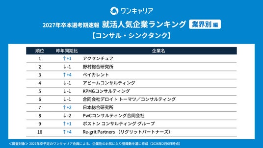 就活支援サービス「ワンキャリア」を展開する株式会社ワンキャリア(本社:東京都渋谷区、代表取締役社長 執行役員CEO:宮下 尚之、以下「ワンキャリア」)は、「ワンキャリア 就活人気企業ランキング【業界別編】(27卒本選考期速報)」を発表しました。