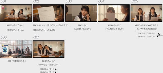 「特濃メイト 塩ミルク」篇は、白紙の進路希望調査用紙を前に、KEIKOさんとRINONさんが「う~ん…」と頭を悩ませているシーンから始まります。悩んだ末、RINONさんが「AIに聞いてみる?」とおどけて見せると、KEIKOさんもいたずらっぽく微笑みながら「そんな時はこうして…」と応じます。「ダンマリを決め込むのだ!」という言葉を合図に2人揃って「特濃ミルク8.2 塩ミルク」を口へ運びます。すると、その濃厚な味わいに、思わず「う~ん♪」と声を漏らし、至福の表情を浮かべる2人。いつの間にか悩みの「う~ん…」がおいしさの「う~ん♪」に変化し、「特濃ミルク8.2 塩ミルク」の味わいに浸っているのでした。