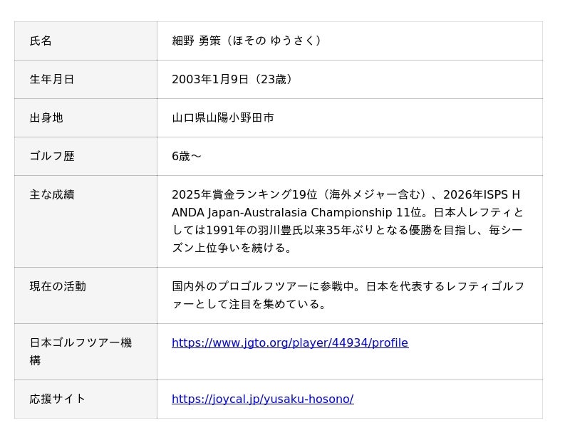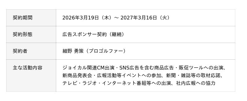 株式会社ジョイカルジャパン(本社:東京都千代田区/代表取締役社長 CEO 早川 由紀夫、以下:ジョイカルジャパン)は、プロゴルファー・細野勇策選手とのスポンサー契約を、2026年3月19日付で更新いたしましたことをお知らせします。