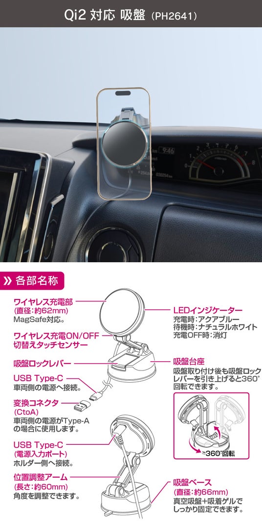 Qi2対応 マグネットスマホホルダー 吸盤(PH2641)強力な真空吸盤でダッシュボードなどにしっかり固定・設置できる吸盤タイプのスマホホルダーです。Qi2正規認証ワイヤレス充電・最大15W(iPhone)の高速充電に対応。