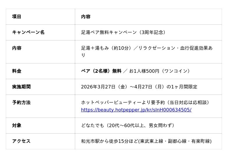 靴とフットケアのお店【OSANPO】(所在地:埼玉県和光市/代表:星諒子)は、2026年3月27日(金)より、地域の方にフットケアや正しい靴・歩き方の重要性を知っていただくことを目的に、「足湯ペア無料キャンペーン」を開始いたします。お一人様でのご利用は500円。湯もみを含む約10分の足湯体験を提供します。