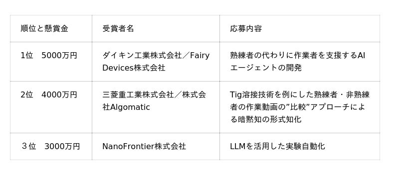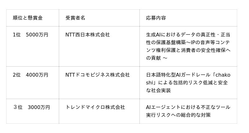 経済産業省とNEDOは、生成AI分野の研究開発・社会実装の促進を目指したNEDO懸賞金活用型プログラム「GENIAC-PRIZE」(以下、本事業)において、社会課題・官公庁・安全性の3領域4テーマ、の受賞者を決定し、3月24日(火)の表彰式で受賞者を発表しました。