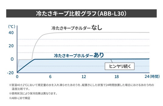 アイスパック シリコーン氷のうタイプ[ABB-L30](一例)の保冷力について左のグラフは、約40℃の環境下で、氷のうを魔法瓶構造の冷たさキープホルダーに入れ続けた場合には、氷のう内の温度が24時間後も約0℃に保たれていることを表します。