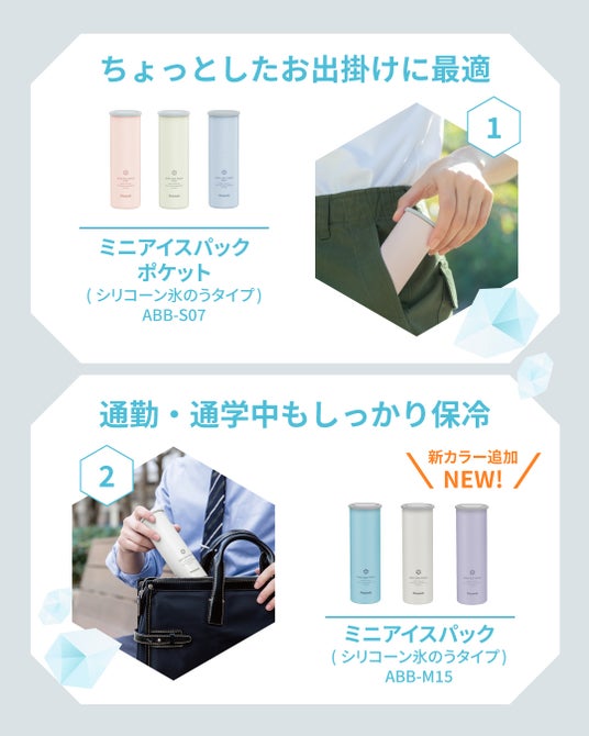「アイスパック」シリーズは、2021年の発売以来大ヒットしているピーコック魔法瓶の看板商品です。グッドデザインアワード受賞ならびに、フェーズフリー認証を取得しており、年々高まる熱中症への対策や、災害時にも活用できる商品として、TVをはじめ、多数のメディアで紹介されています。昨年から類似品も発売されていますが、パイオニアであり魔法瓶メーカーが作る品質と保冷力への信頼から、おかげさまで「元祖 アイスパック」として、選び続けられています。