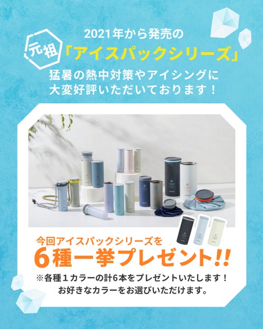 ピーコック魔法瓶工業株式会社(本社:大阪市、社長:山中千佳)は、2026年3月25日(水)から4月1日(水)までの期間、昨年大ブレイクして夏本番前に一時的に売り切れた人気商品「アイスパック」シリーズに、今年さらに新しいアイテムが仲間入りしたことを記念して、「アイスパック」シリーズ全6種、抽選で3名様にまとめて当たる、夏先取りの熱中対策啓発キャンペーンをInstagram公式アカウントにて開催します。