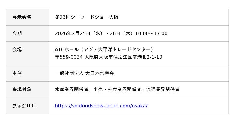 株式会社ヤマトバイオレッツ(本社:福岡県大野城市/ふくやグループ/代表取締役:梁川 剛一)は、2026年2月25日(水)・26日(木)に大阪・ATCホール(アジア太平洋トレードセンター)で開催された「第23回シーフードショー大阪」に出展いたしました。