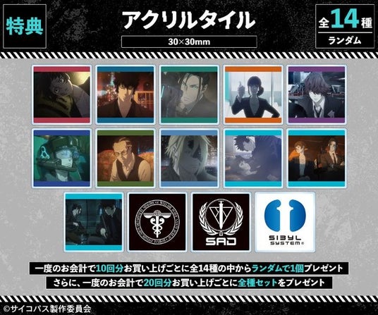 一度のお会計で10回分ご購入ごとに特典アクリルタイル(全14種)の中からランダムで1個、20回分ご購入ごとに全種セットをプレゼント!
