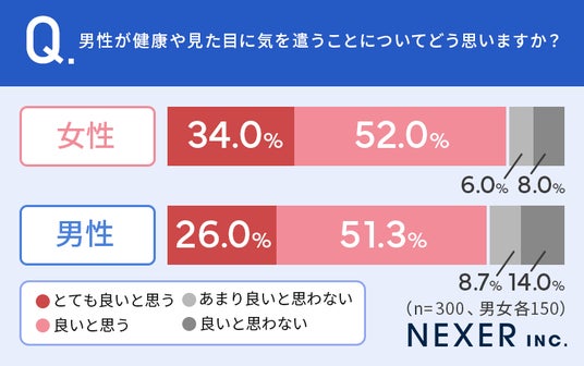 まず、全国の50代以下の男女300名に、男性が健康や見た目に気を遣うことについてどう思うかを男女別に聞いてみました。