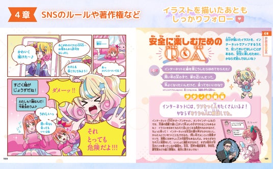 デジタルイラストの章では、タブレットやペンがなくても、スマホと無料アプリ、指で楽しむ方法を紹介。絵を描いたあと、投稿する際の注意点までカバーされていて、1冊あれば最初から最後まで、安全に楽しく絵を描けます。