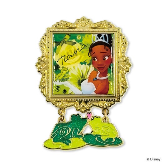 『プリンセスと魔法のキス』に登場する「ティアナ」と、カエルになった「ナヴィーン王子」が描かれており、カエルをモチーフにしたチャームがゆらゆら揺れる仕様になっています。爽やかなグリーンとゴールドフレームのコントラストが、持ち物やファッションに華やかなアクセントを添えます。