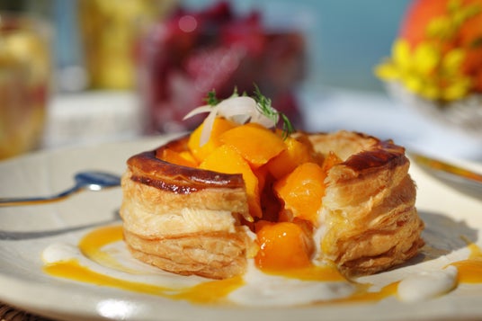 メインディッシュには「マンゴーのヴォロヴァン(*2)」を提供します。旬のマンゴーとイーチョーバ(フェンネル)を合わせ、軽い口当たりのチーズをパイ生地の中に入れて焼き上げた、甘さとのバランスがちょうど良い一品。焼きたてのヴォロヴァンに、冷たいマンゴーソースをかけて温度のコントラストを楽しみます。アップルマンゴーと呼ばれている、とろけるような舌ざわりの「アーウィン」や、濃厚で深い甘さのある「キーツ」など、シェフが厳選したその日一番の食べごろのマンゴー(*3)を使用します。