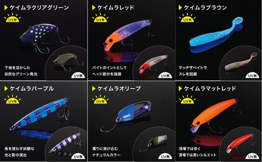 ※2ケイムラは釣り業界の専門用語で「蛍光紫(ケイコウムラサキ)」の略称。紫外線が当たると青白く光るので、暗い水のなかにいる魚にもアピールできると言われています。