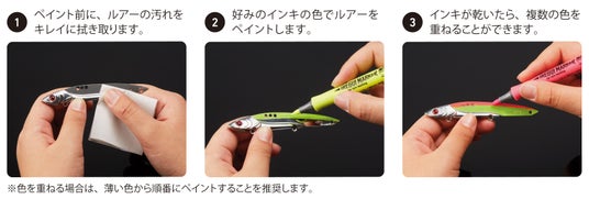 その日の状況に応じて、釣り場で簡単・スピーディーにペイント加工ができるマーカーは、釣果アップを目指す釣り人にぴったりのアイテムです。