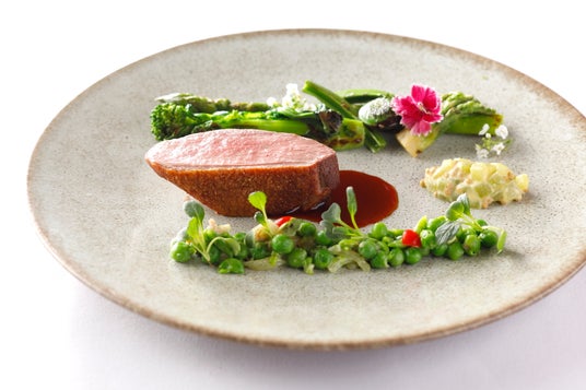 国産鴨むね肉をじっくり丁寧に火入れし、やわらかく仕上げました。グリーンアスパラガスと山菜を合わせた春の味わいを楽しめるひと皿です。