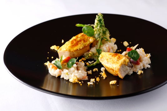 「北寄貝と白とり貝のリゾット サワラの菜種焼き風 ベアルネーズソースとともに」