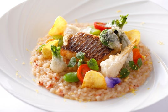 「愛媛県産真鯛のロティと桜えびのリゾット 旬の山菜のフリット レモンの香り」