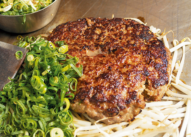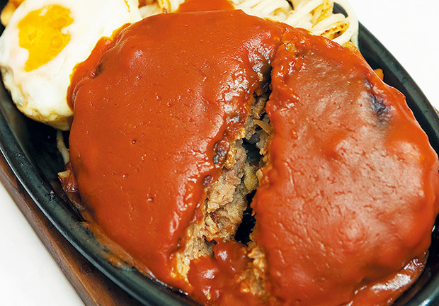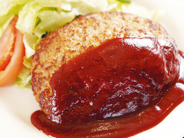 大盛りミンチ肉と玉ねぎを使った300gの巨大バーグが自慢。肉汁の旨みを閉じ込めるために独自の焼き方を採用。ナイフを入れると肉汁が堰を切ったようにジュワっと溢れ出す。ケチャップにワインを入れて酸味のあるデミグラスソースもこの肉汁に合う。