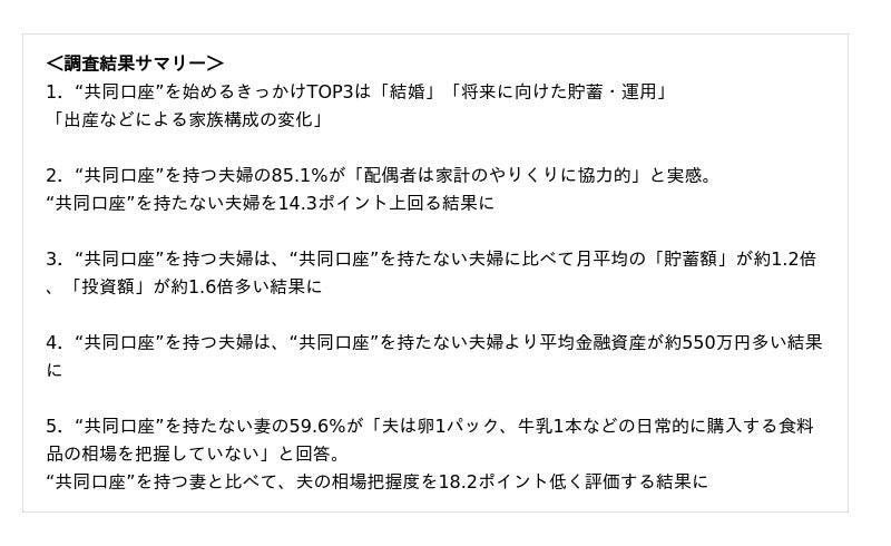 今回の調査から、“共同口座”を活用してふたりでお金を管理することが、夫婦の貯蓄や資産形成にプラスの影響を与えていることがわかりました。