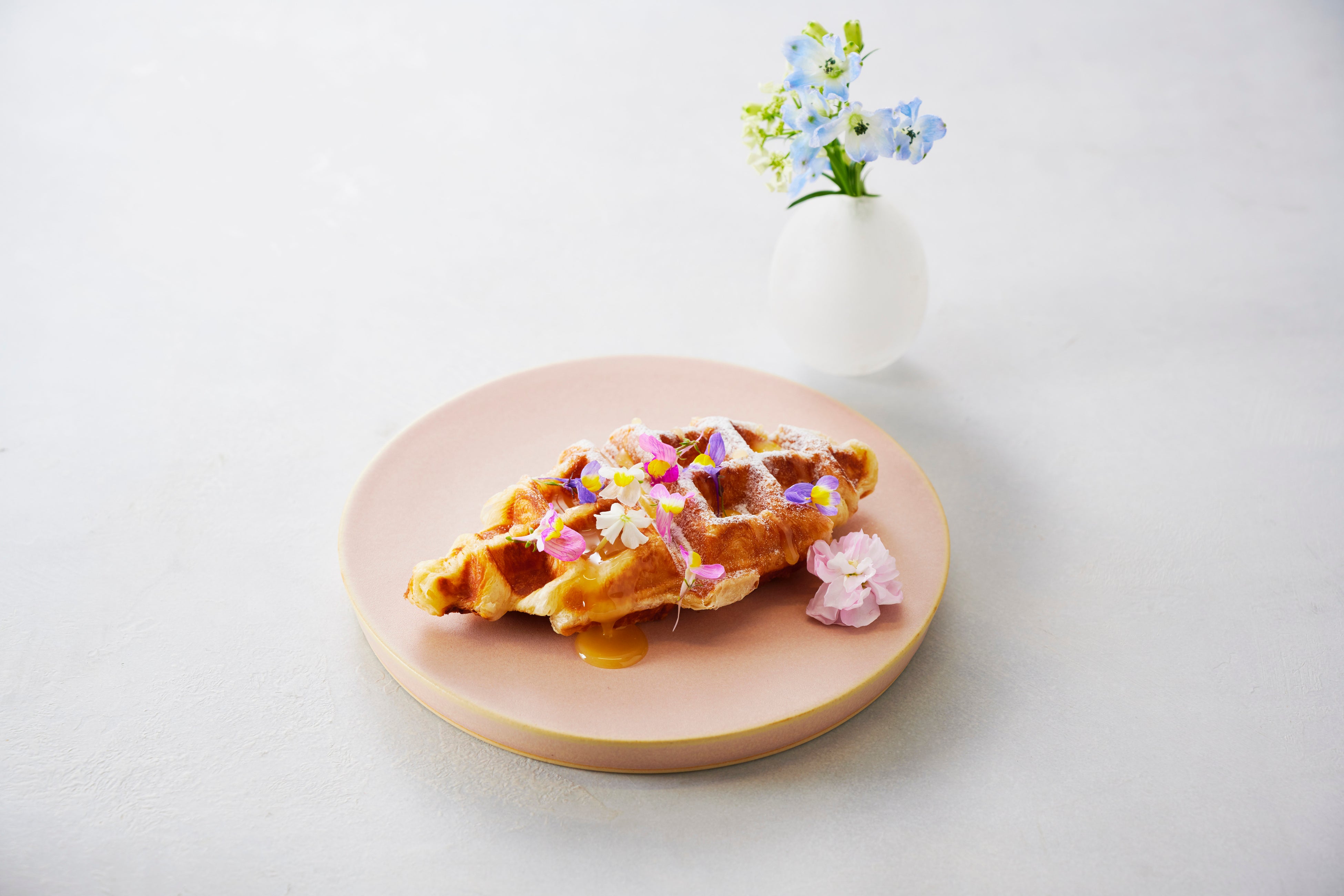 ご注文いただいてから焼き上げる人気のクロワッサンワッフルに、期間限定でエディブルフラワーをトッピング。ラベンダーのはちみつと粉砂糖のやさしい甘みがクロワッサンのバターの風味をより一層に引き立てます。