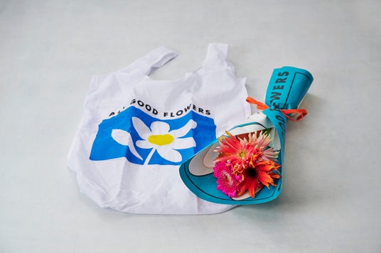 ガーベラをミックスした花束とALL GOOD FLOWERSのシグネチャーがプリントされたバッグのセット。プレゼントとしてはもちろん、ご自宅用としても気分が上がる、おしゃれでかわいい組み合わせです。