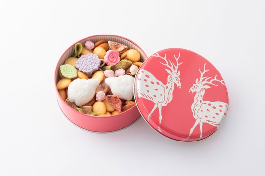 小さなあられや金平糖などが散りばめられた「楽しい」「美しい」「かわいい」幸せがいっぱい詰まったお菓子缶。紫陽花と薔薇をかたどった季節の干菓子も添えたこの時期だけの特別な品は、お祝いや手土産にぴったりです。