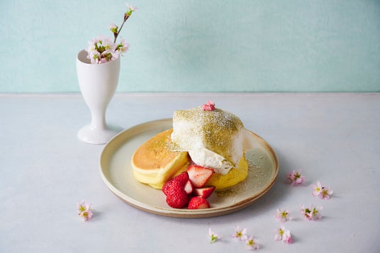 丁寧に焼き上げたふわっふわの自慢の生地に抹茶アイスと桜餡、エスプーマのクリームをたっぷりのせて、もちもちの求肥と桜の塩漬けをトッピング。まるで和菓子のような写真映えも抜群のパンケーキです。