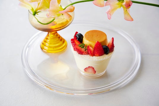 オーガニック卵で焼いたプリンとふんだんに使われたいちごが目を引く、クラシックな装いのスイーツ。グラスの中にはいちごのコンフィやパウンドケーキ、シャンティクリームが幾層にも重なり、最後まで楽しく味わえます。