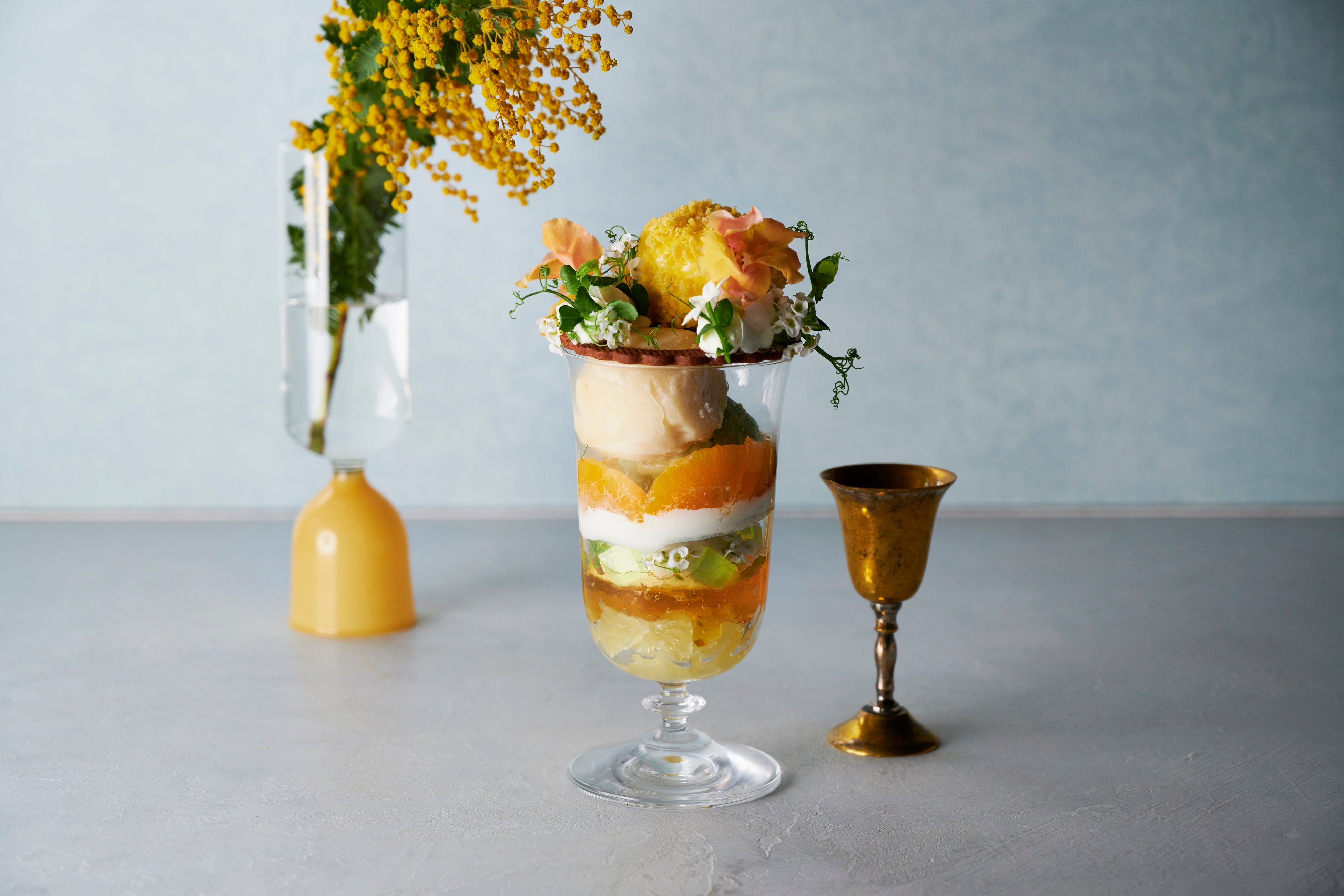 ミモザの花をイメージしたパフェ。メインの柑橘にミード(蜂蜜のお酒)を合わせ、ピスタチオやヨーグルト、ジャスミンのフレーバーでフルーティーなニュアンスを演出。桜をモチーフにしたカクテルとのペアリングは、味覚と香りで春を楽しめるセットです。