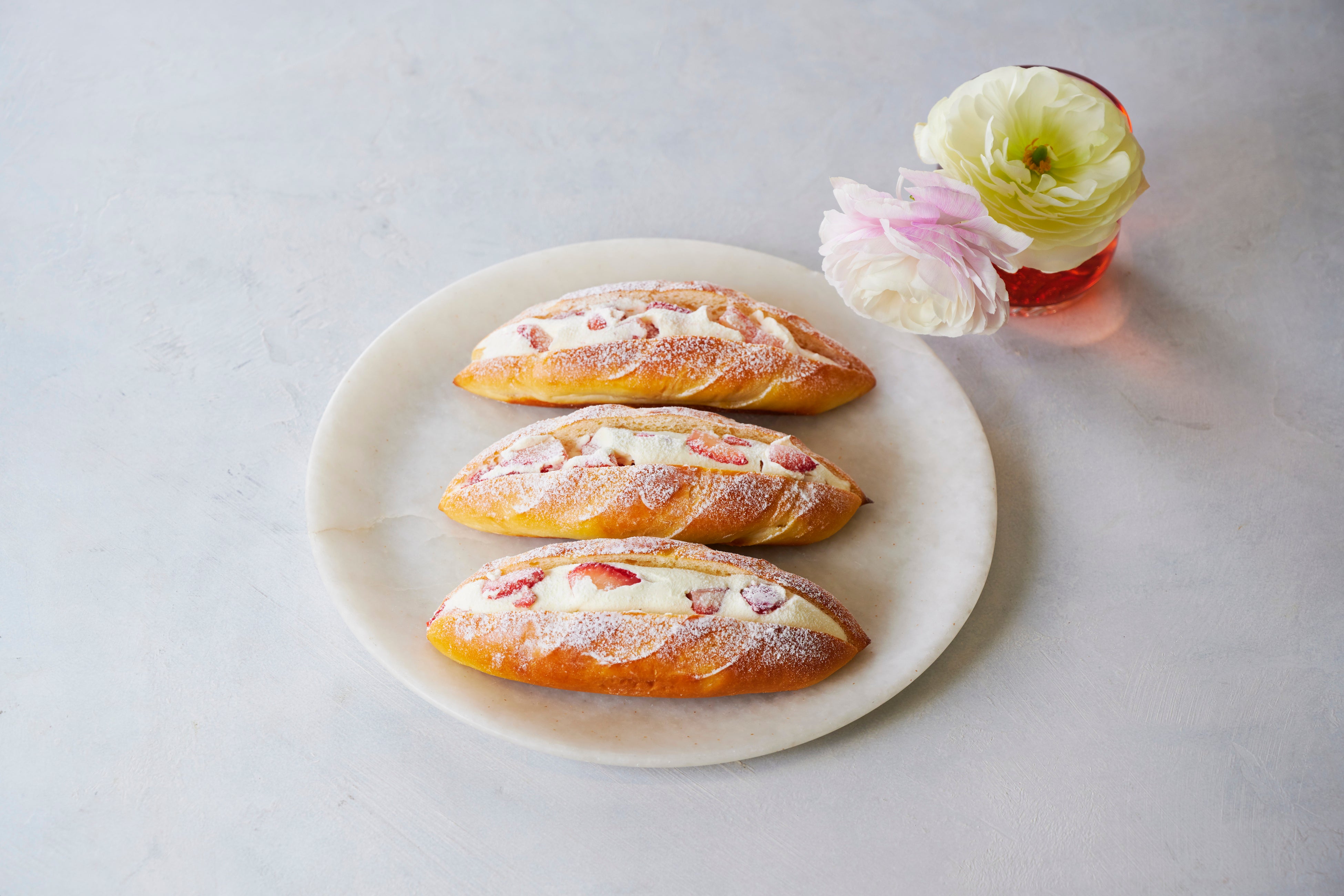 やわらかなパン生地にミルキーな練乳クリームを挟み、さらに旬のフルーツ、苺を加えた季節限定ミルクフランスです。甘みと酸味がバランスよく仕上げられた一品です。