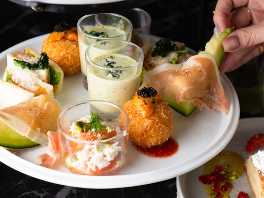 下段には、涼やかな彩りと旬の恵みを活かしたセイボリーを揃えました。爽やかな「ビシソワーズ ペストジェノベーゼ」や、「国産メロンとプロシュート」、ウニの旨みが広がるアランチーニなど、甘美なスイーツの合間に嬉しい本格的な味わいをお愉しみいただけます。