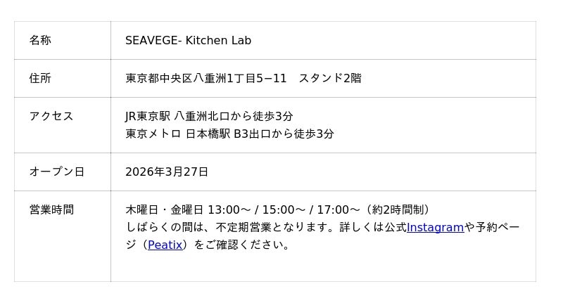 合同会社シーベジタブル(共同代表:蜂谷 潤、友廣 裕一、本社:高知県安芸市)は、東京・八重洲の拠点2階に開設した実験の場「SEAVEGE- Kitchen Lab」にて、海藻を主役にした体験プログラム「Open Kitchen」の予約受付を開始します。