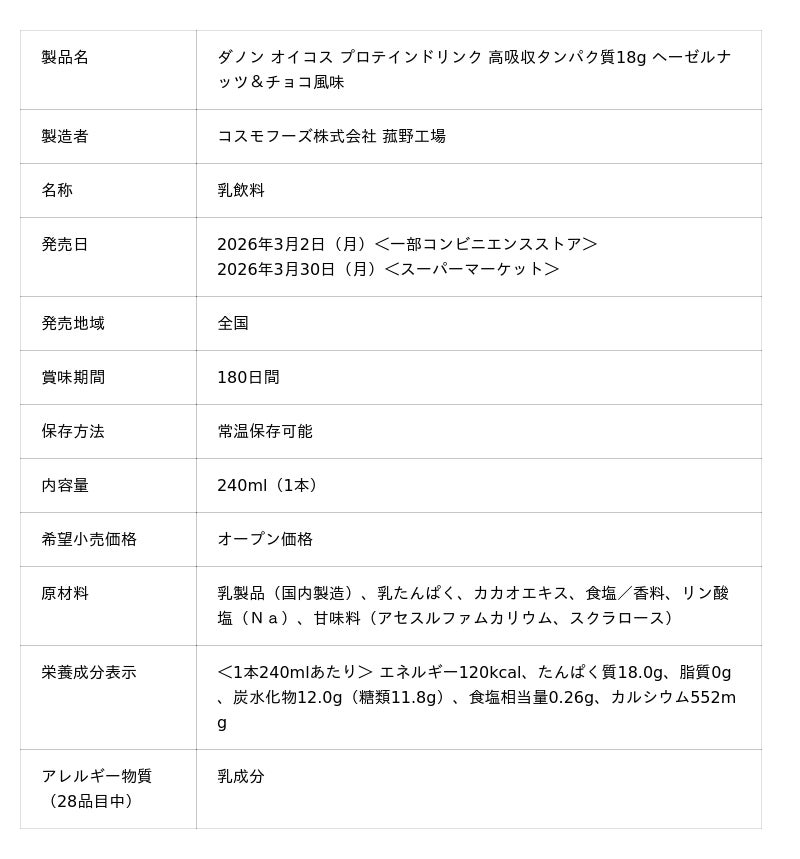 ダノンジャパン株式会社(本社:東京都目黒区、代表取締役社長:ロドリゴ・リマ、以下ダノンジャパン)は、カラダを動かすすべての人の良質なタンパク質補給を応援する「オイコス」から、3月上旬より一部コンビニエンスストアで先行発売していた「オイコス プロテインドリンク 高吸収タンパク質18g ヘーゼルナッツ&チョコ風味」を、3月30日(月)より全国のスーパーマーケットで販売開始します。