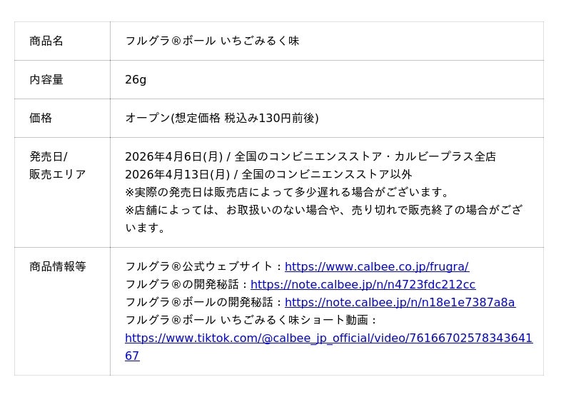 カルビー株式会社(本社:東京都千代田区、代表取締役社長兼CEO:江原 信)は、シリアルブランド売上No.1(※1)の「フルグラ(R)」がひとくちサイズにまるくなった「フルグラ(R)ボール」と、サクマ製菓株式会社(本社:東京都目黒区、代表取締役社長:山田 流石、以下「サクマ製菓」)が展開するキャンディ「いちごみるく」が初めてコラボレーションした新商品『フルグラ(R)ボール いちごみるく味』を2026年4月6日(月)から全国のコンビニエンスストアとカルビー直営店「カルビープラス」先行で期間限定発売します。コンビニエンスストア以外の店舗では2026年4月13日(月)から期間限定発売します(2026年9月上旬終売予定)。