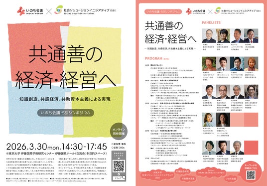 いのち会議と大阪大学社会ソリューションイニシアティブ(SSI)は、2026 年 3 月 30 日(月)、東京大学 伊藤国際学術研究センター 伊藤謝恩ホールにて、いのち会議・SSI シンポジウム「共通善の経済・経営へ ― 知識創造、共感経済、共助資本主義による実現 ―」を開催します。世界が直面する複雑な社会課題に対し、単なる効率追求型の資本主義ではなく、人々の共感や協働を基盤とした新しい経済のあり方が求められています。いのち会議は企業・行政・専門家・市民が「いのち」を起点に協働するプラットフォームとして活動しており、大阪大学 SSI は学術知を社会に接続し社会変革を促す拠点として実践を重ねてきました。同時に、経済同友会が提唱する「共助資本主義」、さらには「共助資本主義の実現に向けた大学連合(Solve)」の動きが、社会の新たなダイナミズムを起こしつつあります。