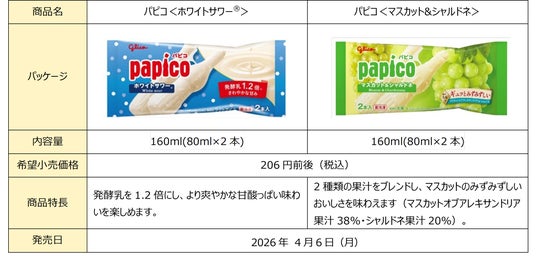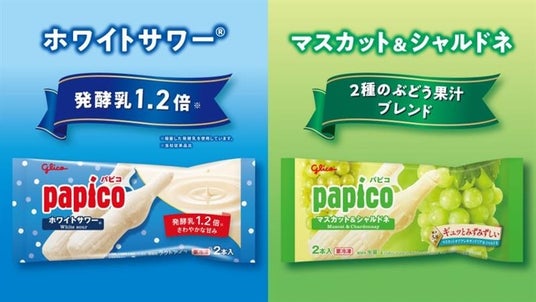 江崎グリコ株式会社は、なめらかな食感が特長のロングセラーブランド「パピコ」の「パピコ<ホワイトサワー(R)>」と「パピコ<マスカット&シャルドネ>」を、2026年4月6日(月)に全国でリニューアル発売します。「パピコ<ホワイトサワー(R)>」は独自の発酵乳を従来の1.2倍にします。「パピコ<マスカット&シャルドネ>」は2種類の果汁をブレンドし、果実のみずみずしい味わいを強化します。