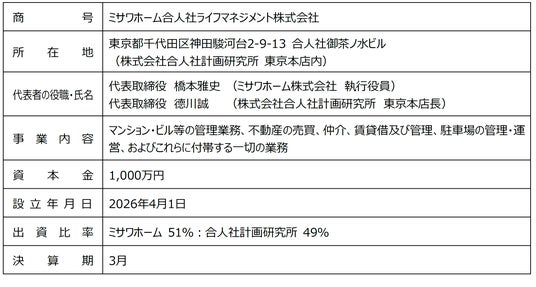 ミサワホーム株式会社(代表取締役社長執行役員 作尾徹也、以下 ミサワホーム)は、2026年3月5日に、株式会社合人社計画研究所(代表取締役 福井滋、以下 合人社グループ)と資本業務提携を締結いたしました。これに基づき、既存分譲マンションのリプレイス(管理見直し)を主目的とした合弁会社「ミサワホーム合人社ライフマネジメント株式会社(以下 新会社)」を、2026年4月1日に設立いたします。