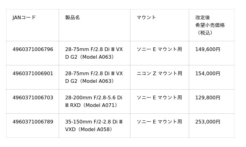 総合光学機器メーカーの株式会社タムロン(本社:さいたま市)は、2026年4月1日(水)より、一部のミラーレスカメラ用レンズの出荷価格および希望小売価格を改定いたします。