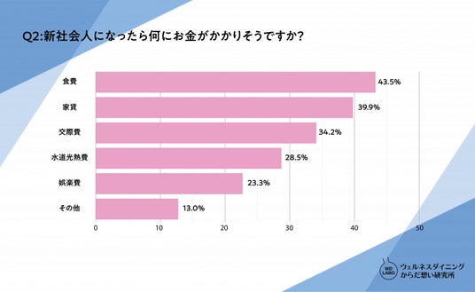 新社会人が特に出費がかさむと予想している項目では、「食費」が43.5%と最も高く、生活費の中でも食費に対する経済的な不安が大きい。