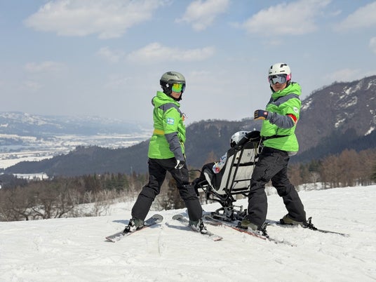 2日目、いよいよゲレンデへ。NPO法人ネージュ(障がい者スキースクール)のサポートのもと、難病を抱えるお子さんたちがデュアルスキー(デュオ)やスノーカートで白銀のゲレンデを疾走しました。デュアルスキーとは、バケットシートの下に2本のスキーが付いた専用機材で、専門トレーニングを受けたネージュのキャストが「パイロット」として操作します。全介助が必要なお子さんでも、安全にスキーの醍醐味を体験できる機材です。