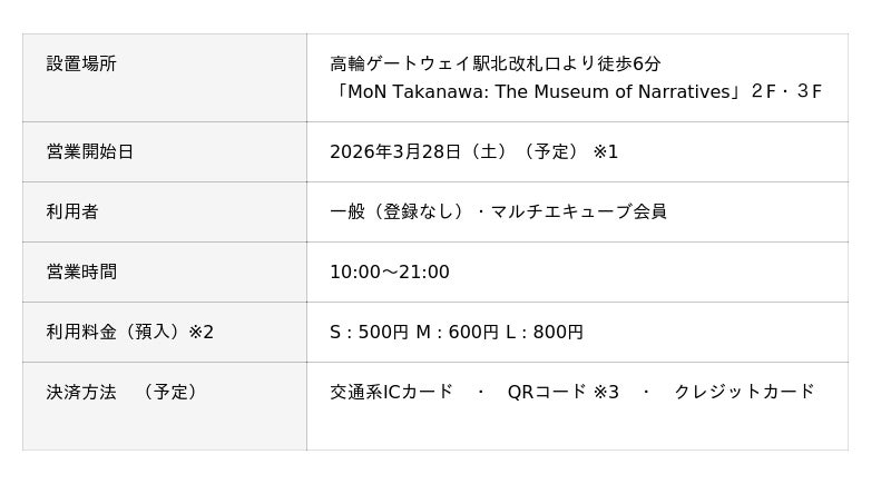 ○株式会社JR東日本スマートロジスティクス(東京都墨田区、代表取締役社長:市原 康史)は、予約・キャッシュレス・多言語対応可能な多機能ロッカー『マルチエキューブ』を3月28日に高輪ゲートウェイ駅最寄りに新たに開館する「MoN Takanawa: The Museum of Narratives」に設置いたします。