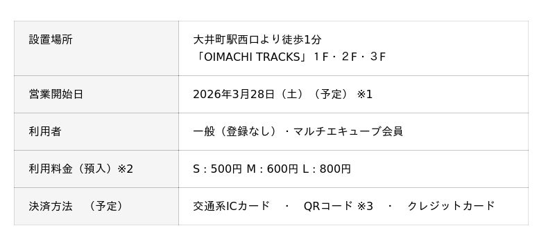 ○株式会社JR東日本スマートロジスティクス(東京都墨田区、代表取締役社長:市原 康史)は、予約・キャッシュレス・多言語対応可能な多機能ロッカー『マルチエキューブ』を3月28日に大井町駅最寄りに新たに開業する「OIMACHI TRACKS」の5箇所に76ボックスを設置いたします。