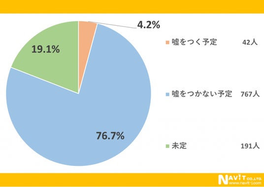 「今年のエイプリルフールは、嘘をつきますか?」という質問については、「嘘をつく予定」が4.2%、「嘘をつかない予定」が76.7%という結果になりました。