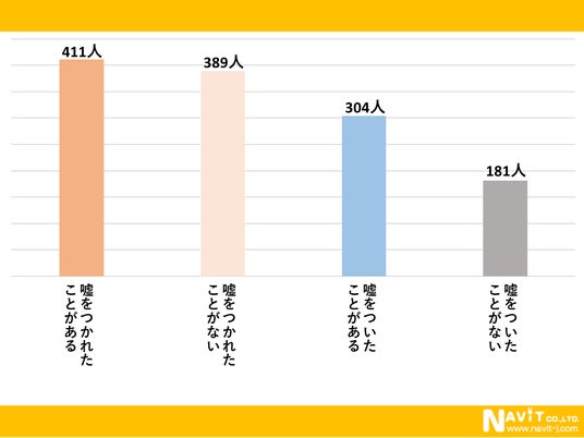 「今までのエイプリルフールに嘘をついたり、嘘をつかれたことはありますか?」という質問を複数回答可で行ったところ、「嘘をつかれたことがある」は411人、「嘘をついたことがある」が304人という結果になりました。嘘をついたりつかれたりしたことがある人は一定数いるようです。