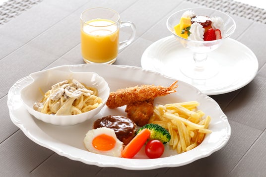 お子さまから絶大な人気を誇る「ハンバーグステーキ」や「唐揚げ&エビフライ」に加え、ホテルシェフ特製の「キノコのクリームパスタ」など、ボリューム満点のキッズプレートをご用意しました。食後のデザートには、思わず笑顔がこぼれる「プリンアラモード」も。親子三世代でのご利用にも最適です。