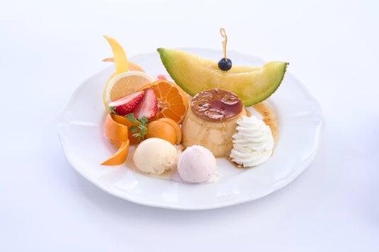 大きなお皿に盛りつけられた、心ときめくプリンアラモード。大き目サイズのプリンに7種のフルーツ、バニラと季節のアイスを合わせました。