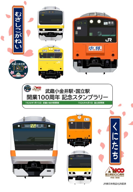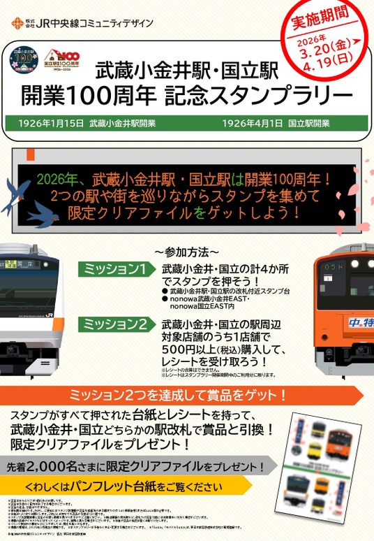 2026年に国立駅と同じく100周年を迎え、同じ中央線の駅でもある武蔵小金井駅とその周辺を巡るスタンプラリーを開催中です。条件を達成した先着2,000名さまには両駅の開業100周年を記念した特別なデザインのクリアファイルをお渡しします。