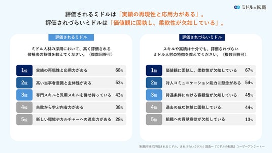 - 評価されるミドルは「実績の再現性と応用力がある」。評価されづらいミドルは「価値観に固執し、柔軟性が欠如している」。- 企業がミドル人材の採用で重視する点は「業務経験」「専門知識・スキル」。実務経験があれば、ターゲット年齢が緩和されるケースも。