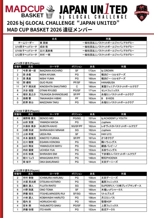 U12男子/U14男子(U12飛級選手含む)/U14女子(U12飛級選手含む)の3チームがJAPAN UN1TEDとして、スペイン最大規模の国際大会「MADCUP BASKET 2026」へ参戦 します。