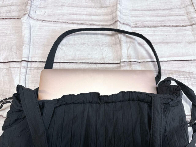 ただ、使ってみて少し気になった点も。バッグ自体は軽量ですが、ハンドルとストラップの幅が細めなため、PCやペットボトルなど重量のあるものを入れると、やや肩に食い込みやすく感じました。