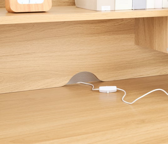 天板後部にコード穴を設け、コンセント周りをすっきりまとめられる設計。タブレット学習やライト使用時も快適です。
